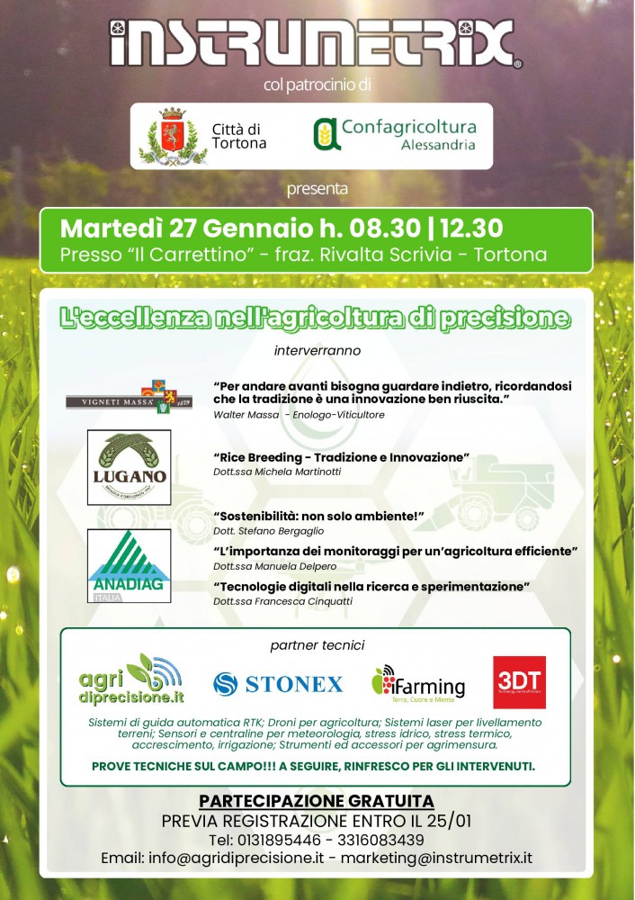 Partecipazione gratuita, previa registrazione entro il 25 gennaio. Telefono 0131 895446 oppure 331 6083439. Mail: info@agridiprecisione.it o marketing@instrumentrix.it .